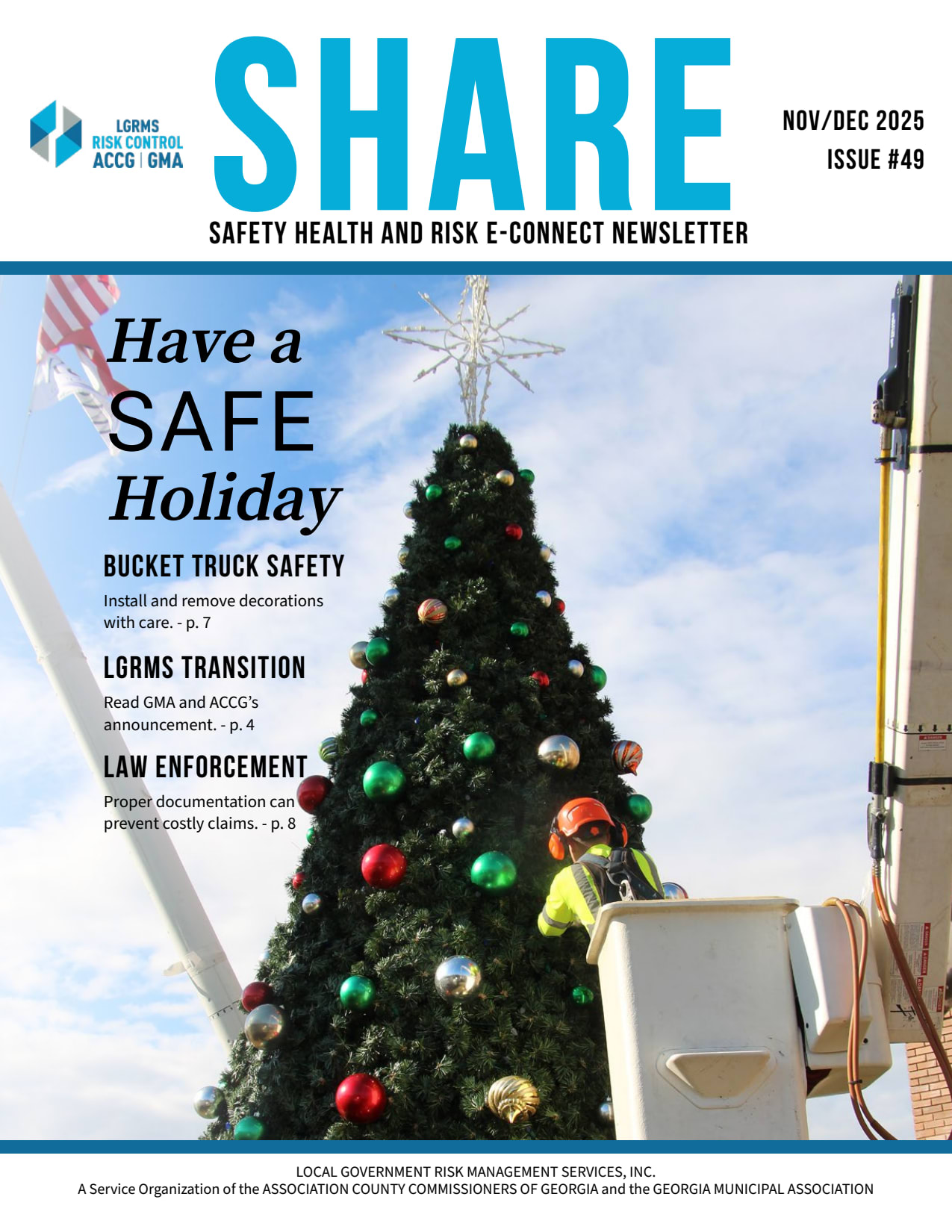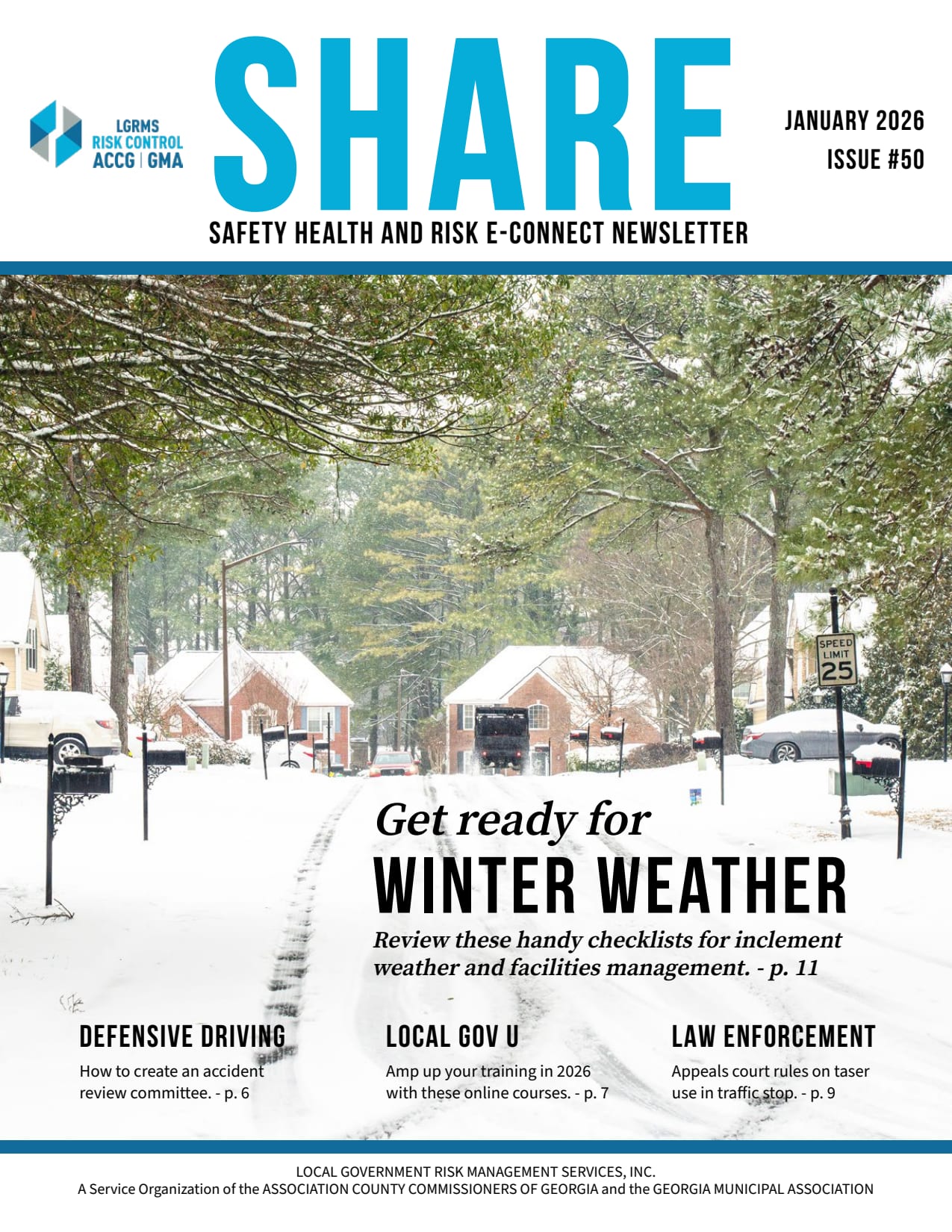 Previously, LGRMS published three Risk and Safety Bulletins; The monthly Safety Theme, geared toward our Workers' Compensation (WC) members, the monthly Liability Beat, geared toward our GIRMA and IRMA Liability members, and Risk Connection, geared toward all pool members. Starting in January 2021, all three of these publications, along with the Health Promotion Services newsletter, "Living Well Georgia", will be covered in a new publication called Safety Health and Risk E-connect (SHARE).